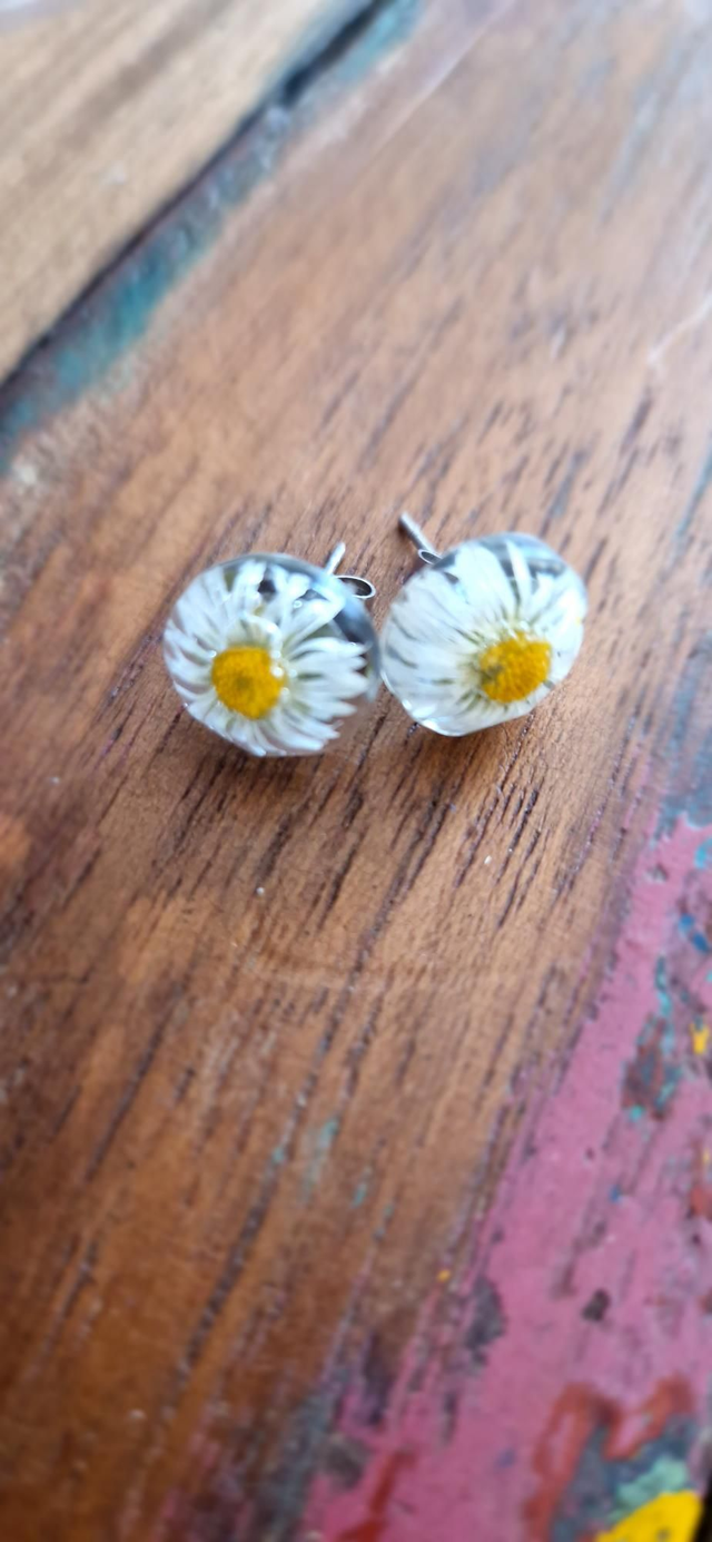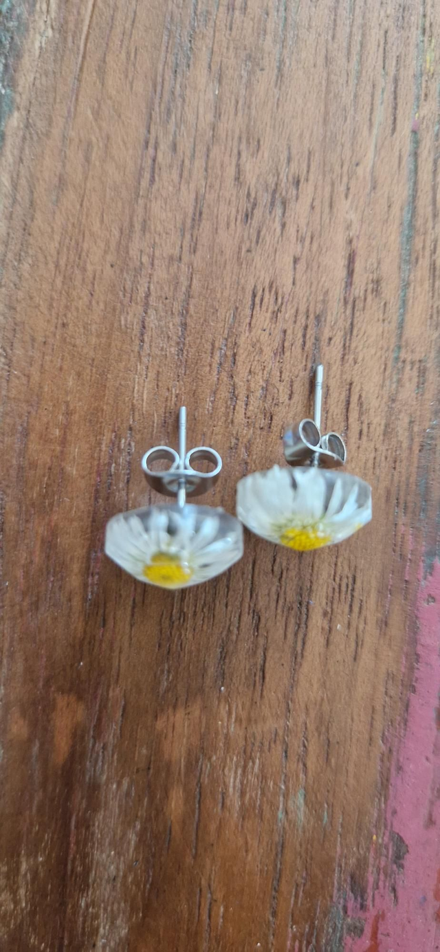 De délicates pâquerettes cueillies puis séchées avec soin se glissent ici dans un écrin de résine cristalline. Chaque paire est unique : la fleur garde sa finesse, son éclat naturel et son charme champêtre.